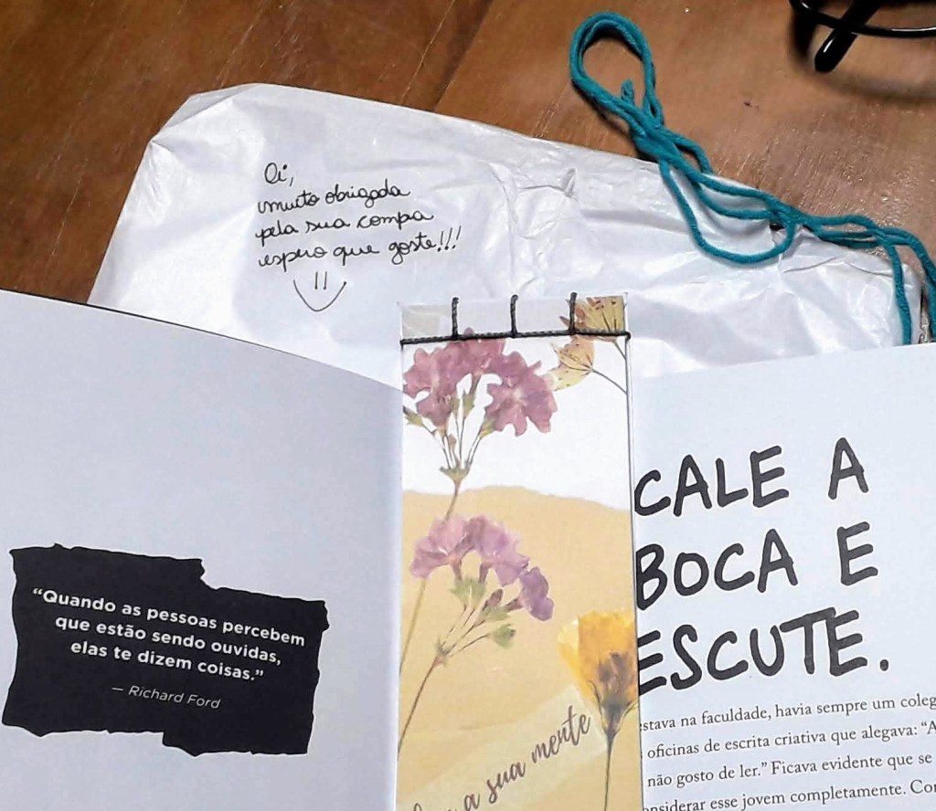 Recentemente, comprei um livro seminovo no site Enjoei e fiquei satisfeitíssima. Além do valor justo do produto, destaco o cuidado da vendedora com a embalagem e com a remessa que chegou antes do prazo pré-determinado. Veja o recado escrito no embrulho que veio dentro da caixa que eu recebi na foto abaixo👇